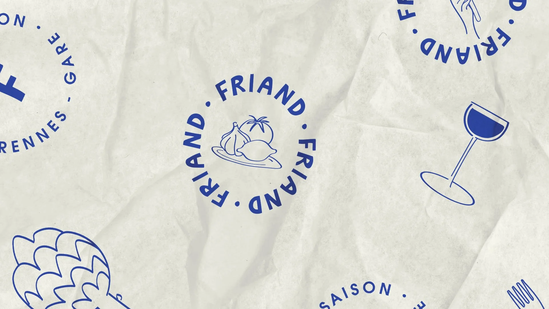 Création de l'identité visuelle pour le restaurant Friand, situé près de la gare de Rennes. Ce projet inclut la conception du logo (sans charte), de quelques illustrations ainsi que des cartes de visite. Friand, ouvert toute la journée, propose une cuisine simple mais raffinée, mettant en avant des produits locaux et de saison. Le logo, avec son style manuscrit en lettres épaisses et ses légères irrégularités, incarne à la fois la simplicité, l'authenticité et la convivialité, reflétant l'esprit chaleureux et accueillant du restaurant.